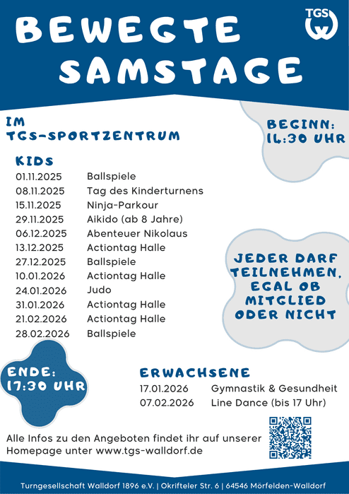 Wir starten ab dem 08.11. mit dem Tag des Kinderturnens und enden am 21.02. mit einem Actiontag Halle. Außer Linedance (bis 17 Uhr) gehen alle Angebote von 14:30 bis 17:30 Uhr und finden bei uns im TGS-Sportzentrum statt.