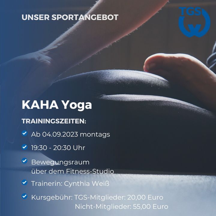 Der Kurs KAHA-Yoga ist optimal zum Stressabbau und zur Mobilisation. Es ist ein effektives Schulter-, Rücken- und Beintraining, um typischen Beschwerden entgegen zu wirken.