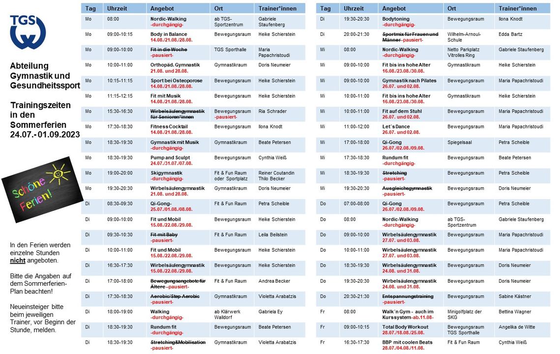 Für alle sportlich Aktiven der Abteilung Gymnastik und Gesundheitssport gibt es einen Sommerplan für den Zeitraum der hess. Schulferien (24.07.-01.09.2023).