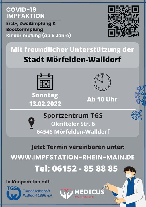 Am Sonntag, 13.02.2022 könnt ihr euch ab 10 Uhr in der TGS-Halle impfen lassen. Die COVID-19 Impfaktion findet in Kooperation mit dem MEDICUS Ärztezentrum statt.