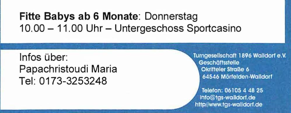 Da nun viele unserer Mitglieder vom Baby- ins Eltern-Kind-Turnen gewechselt sind, gibt es wieder einige freie Plätze für fitte Babys ab 6 Monate. Meldet euch bei Mary Papachristoudi