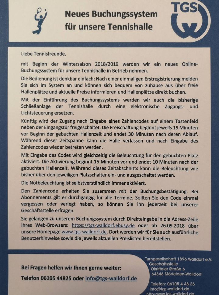 Es gibt ein neues Online-Buchungssystem für unsere Tennisplätze. Nun kann sich jeder Spieler online ganz einfach Plätze reservieren ab Montag 24.9.2018 https://tgs-walldorf.ebusy.de/