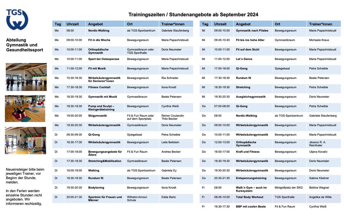 Für alle, die nach der Sommerferienpause ihr Fitness-Programm fortsetzen möchten. Ab dem 26.08. werden wieder alle Stunden angeboten.