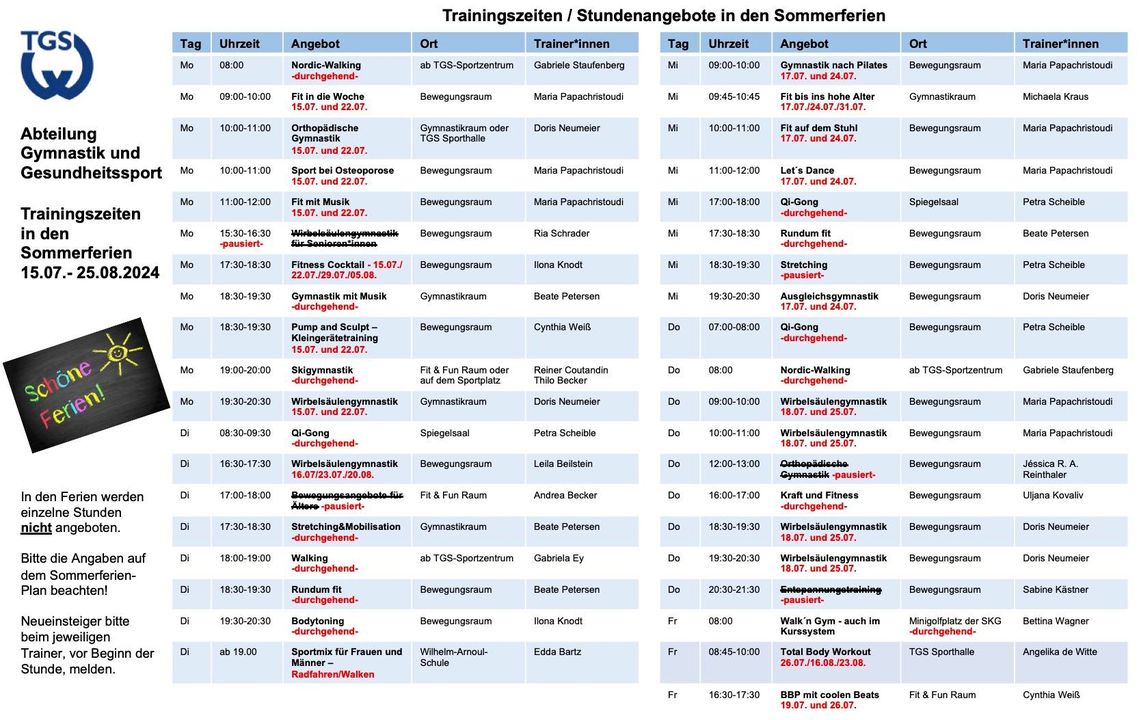 Für alle, die auch in den Sommerferien etwas für ihre Fitness tun möchten. Hier der Plan der Abteilung Gymnastik und Gesundheitssport, wann es welche Angebote gibt. Zum vergrößern, einfach den Plan anklicken