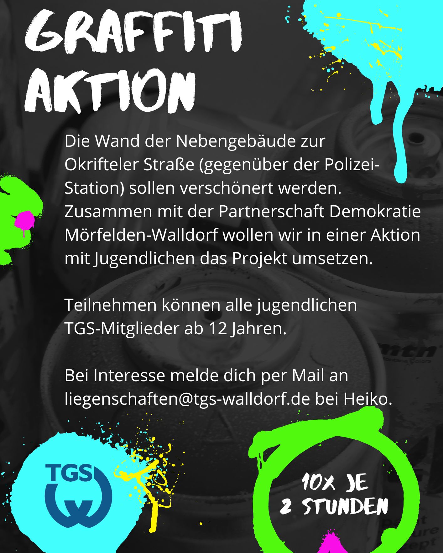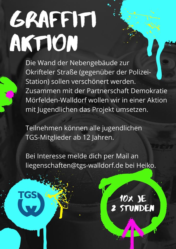 Liebst du es, deine künstlerische Seite auszuleben und die Welt um dich herum mit Farben und Formen zu gestalten? Dann bist du bei uns genau richtig! Zusammen mit der Partnerschaft Demokratie Mörfelden-Walldorf laden wir alle jugendlichen TGS-Mitglieder ab 12 Jahren ein, an unserer spannenden Graffiti-Aktion teilzunehmen.