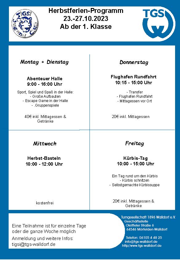 Jetzt noch anmelden unter info@tgs-walldorf.de oder telefonisch unter 06105 44825.