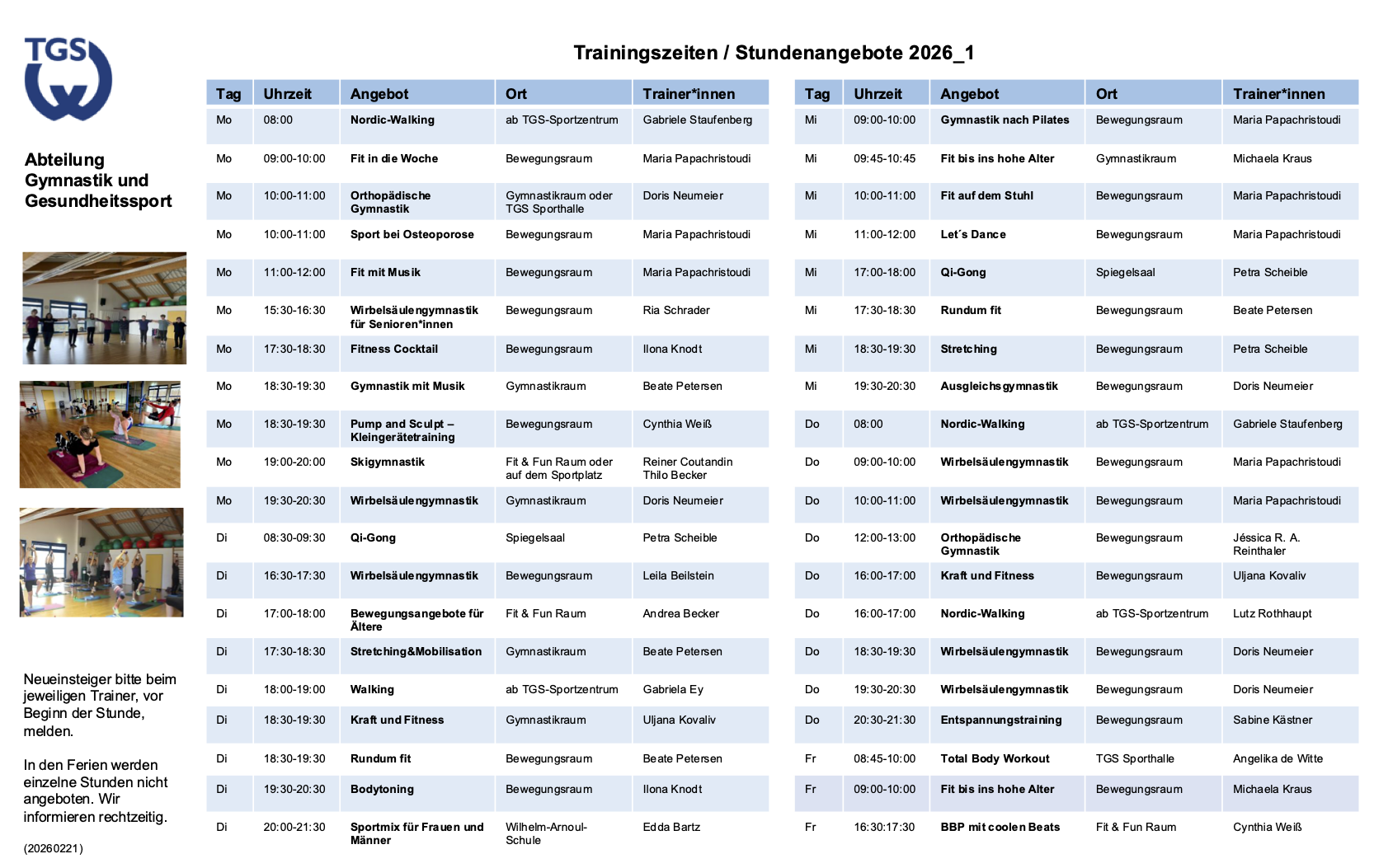 montags 10:00 Uhr, Gymnastikraum im TGS-Sportzentrum (1. Obergeschoss),